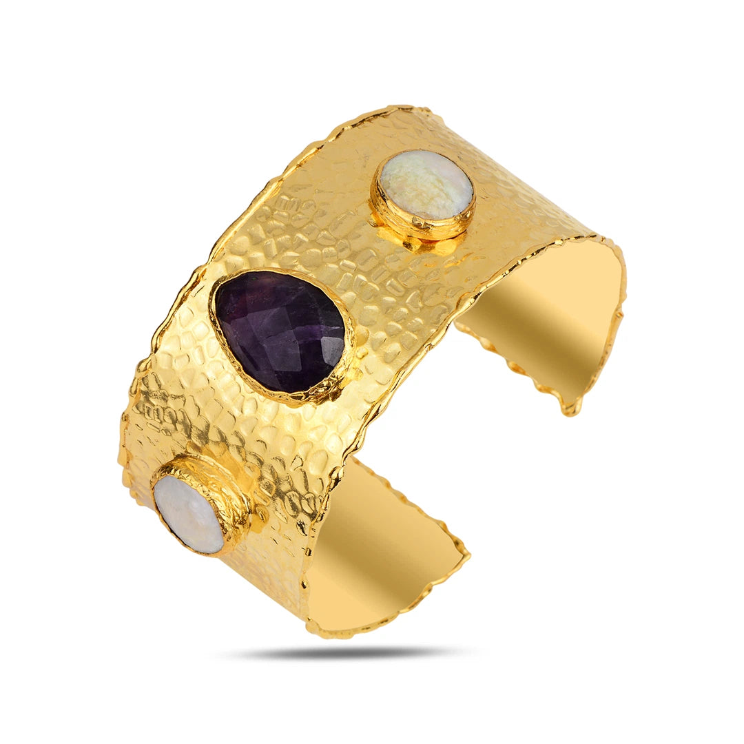 The 22k Gold Plated On Brass Angle Tear Drop Shape Amethyst And Circle Shape Pearl Stone bangle is a stunning and one-of-a-kind piece of jewellery.